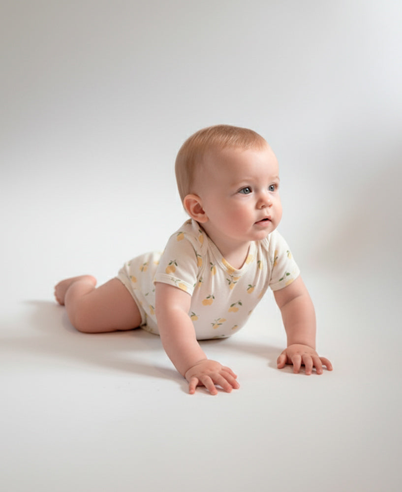 A estampa Limone é o ponto central deste body. Inspirada nas frutas frescas típicas da costa italiana, ela apresenta o limão siciliano em formato pequeno e delicado. Os desenhos surgem de maneira suave, sem excessos, criando um padrão leve que remete à estética das varandas mediterrâneas com limões colhidos ao sol. Para quem busca body de limão, body de limao, body limao siciliano, body de frutinhas ou roupa de bebê com frutas amarelas, essa estampa oferece um visual que se destaca de forma discreta e elegante.