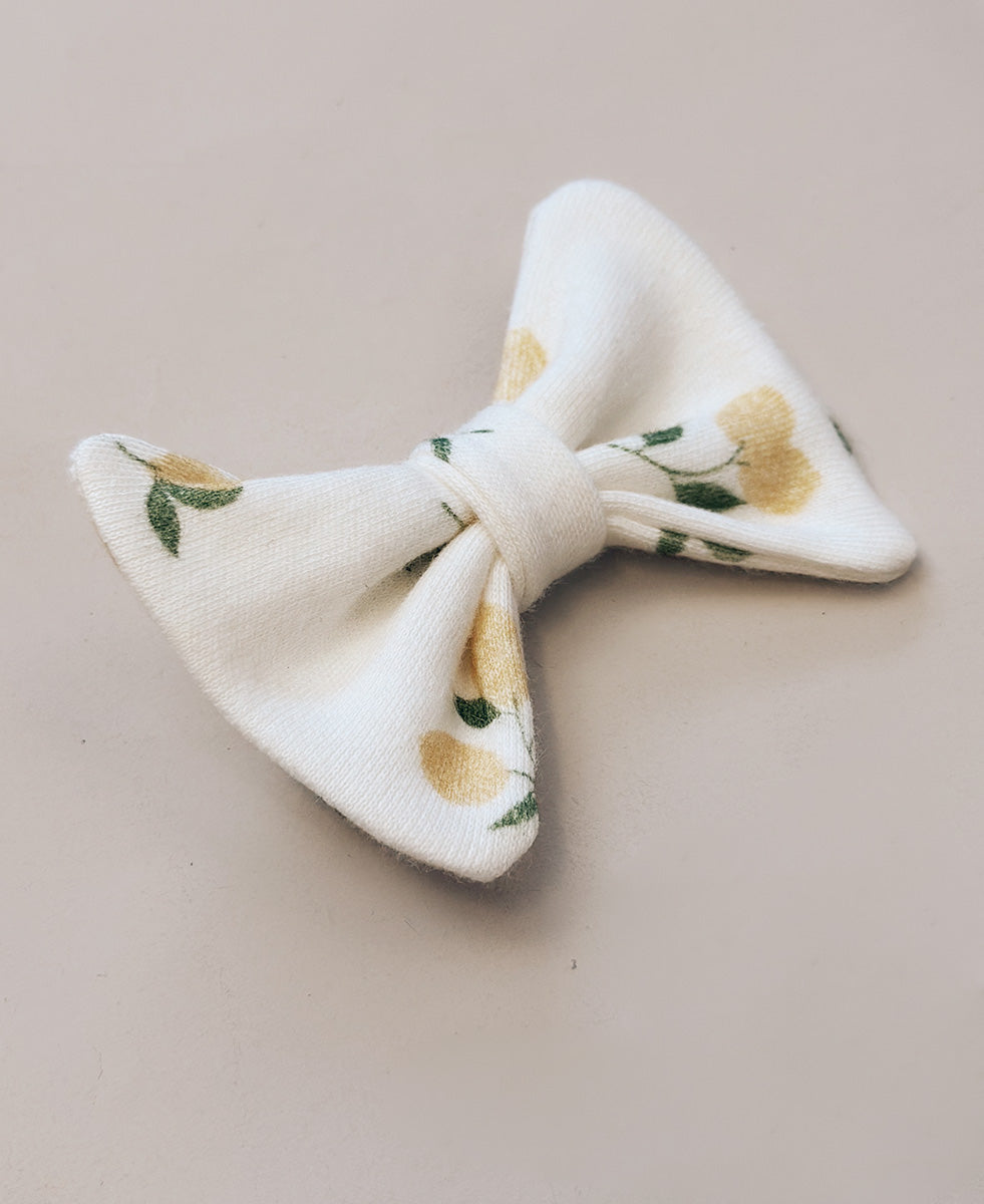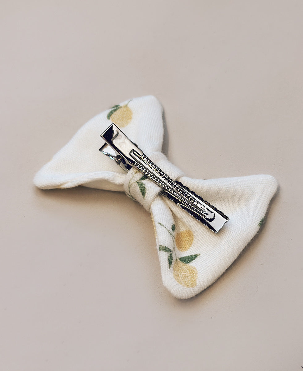 O Laço de Cabelo com Clip Limone faz parte da coleção Italian Summer e foi criado para trazer ao visual infantil a suavidade do verão italiano. Com estampa de limão siciliano em amarelo manteiga, o acessório traduz a luz clara, a brisa quente e o frescor suave que inspiram toda a coleção. Para famílias que buscam laço infantil com frutas, laço de limão, laço com limaozinho ou acessórios delicados para completar looks de verão, esta peça entrega naturalidade, leveza e estética minimalista.