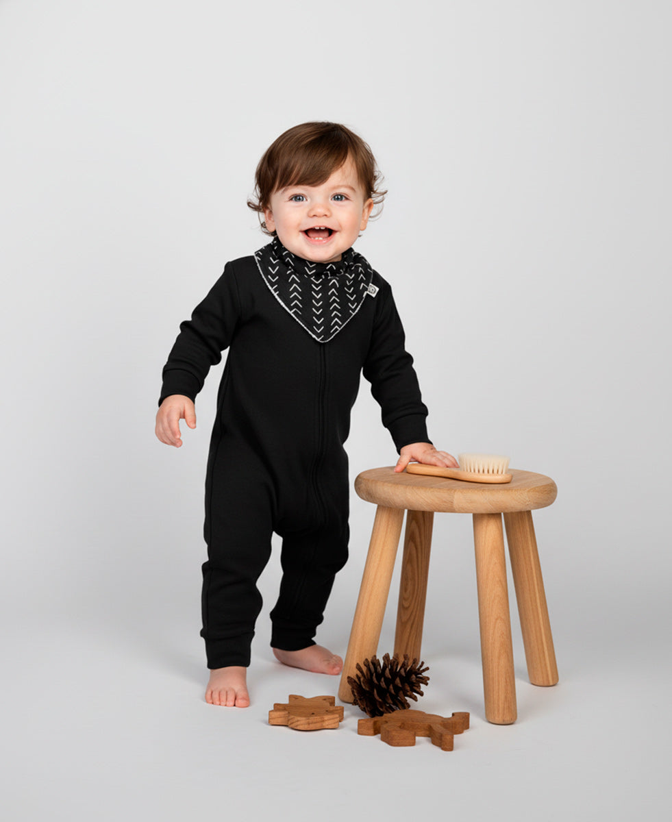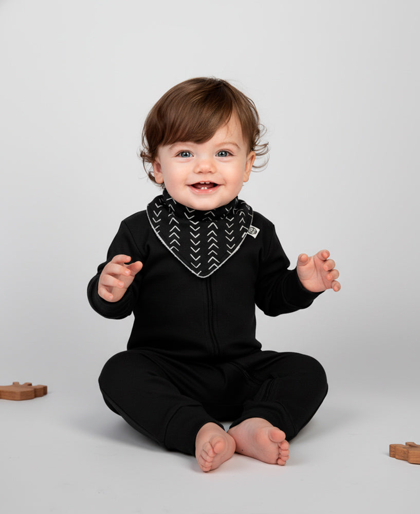 O babador bandana Fishbone traz uma estampa geométrica em preto e branco, que combina perfeitamente com o macacão, criando um visual moderno e harmonioso.