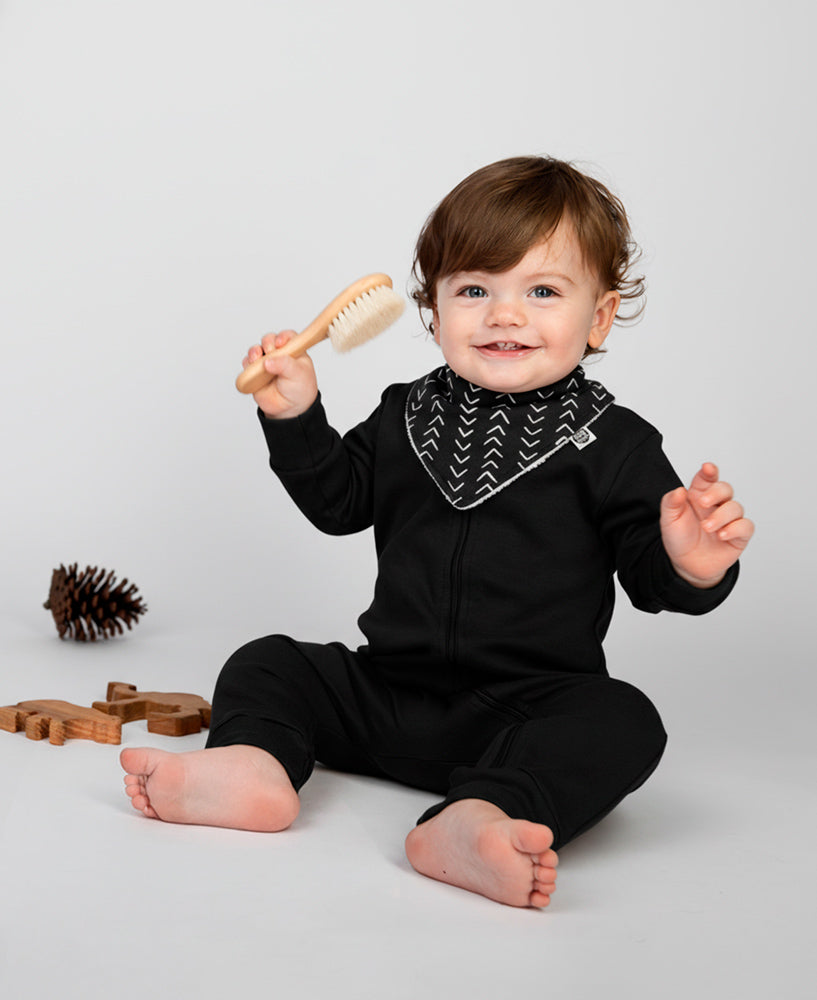O Conjunto Bebê Macacão + Babador | Fishbone e Preto une o design minimalista da MiniMalista Baby com o conforto inigualável do algodão egípcio sustentável, proporcionando praticidade, durabilidade e um toque suave que cuida da pele do bebê.