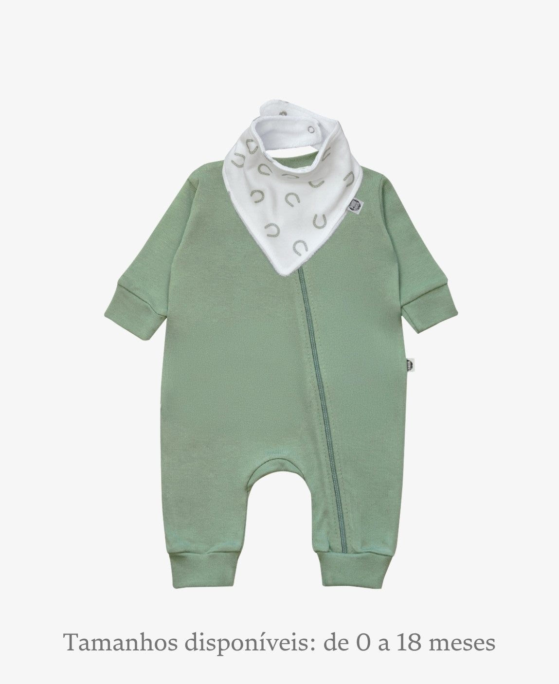 - Detalhes: Modelo macacão com ziper, com opção com e sem pézinho, com proteção na gola, mangas longas, ziper até o pé. Babador com tecido duplo, fundo absorvente, 2 botões de ajuste, modelo bandana.