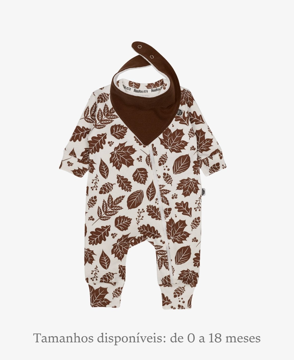 A estampa Fall traz o encanto das folhas secas do outono em tons terrosos, remetendo à natureza e à estação das mudanças, enquanto o babador Oak, em marrom profundo, complementa o visual com um toque de elegância neutra.