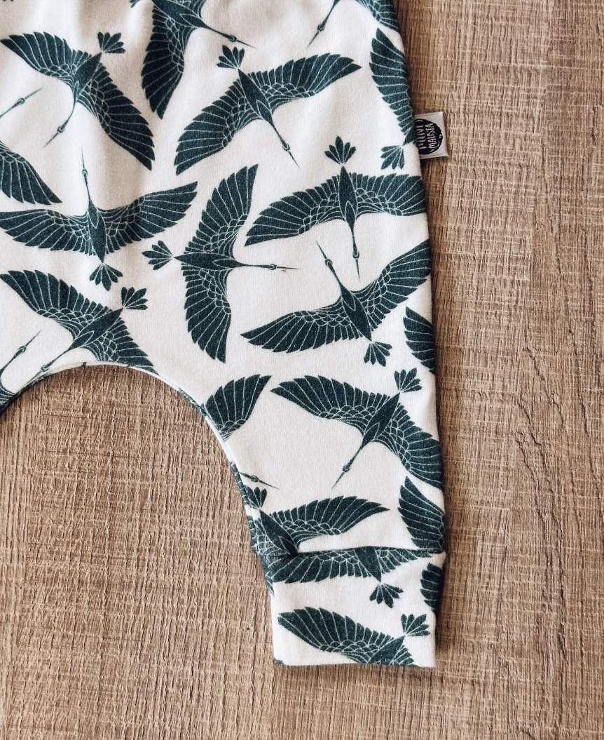 O body manga longa na cor Goblin Blue traz um tom sofisticado — um azul com fundo esverdeado que combina com a leveza das estampas Blue Flock. Já a calça harém garante liberdade de movimento, com modelagem soltinha, cós elástico confortável e o estilo despojado que as mães adoram.