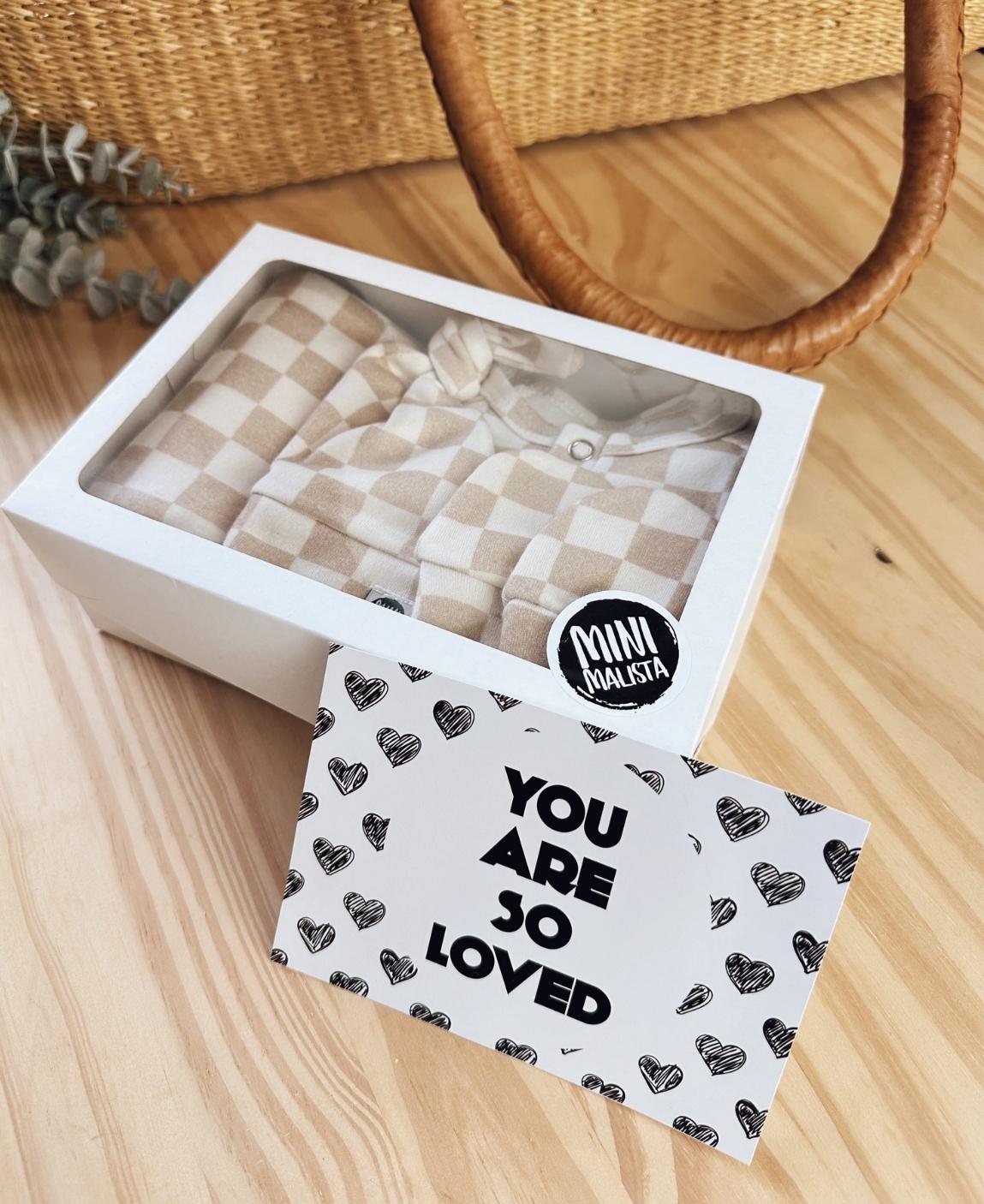 Kit Presente Saída de Maternidade Bebê 4 peças | Racer Beige - Com Caixa Presente