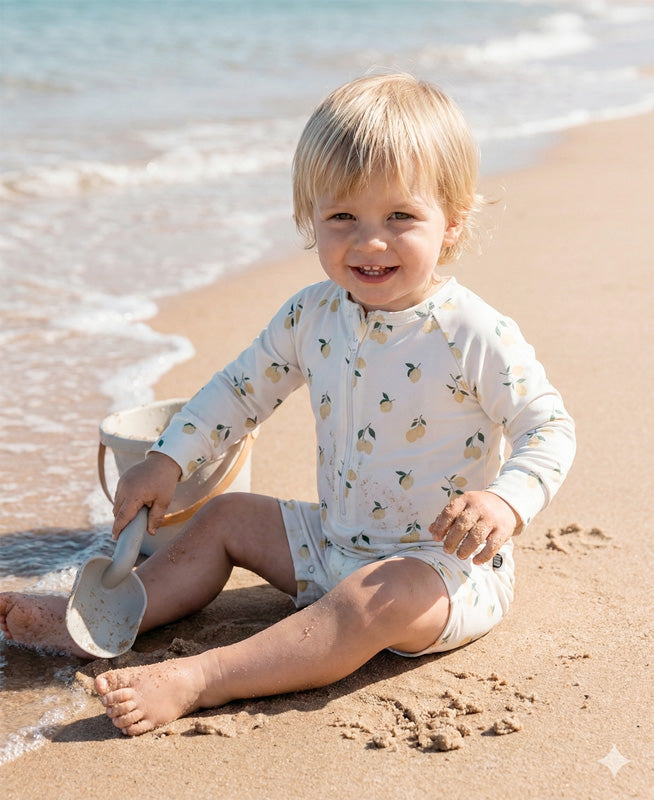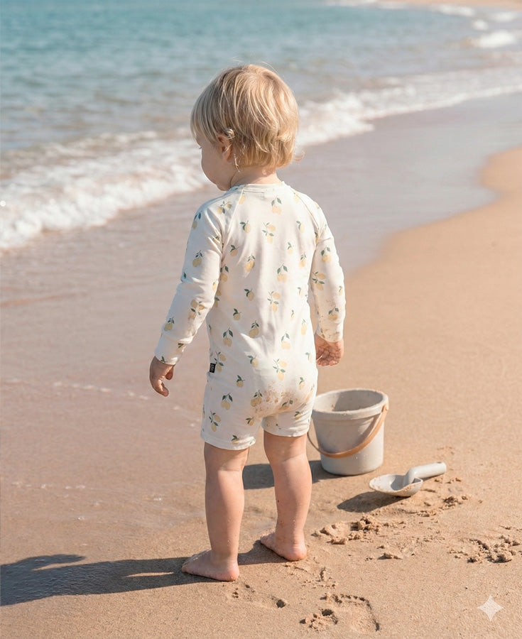 O Macaquinho de Praia Limone protege a pele da criança com leveza e conforto. Com estampa delicada de limão-siciliano, zíper frontal, abertura entrepernas e tecnologia UV50+, ele é perfeito para brincar na água e na areia dentro da estética iluminada da Italian Summer.