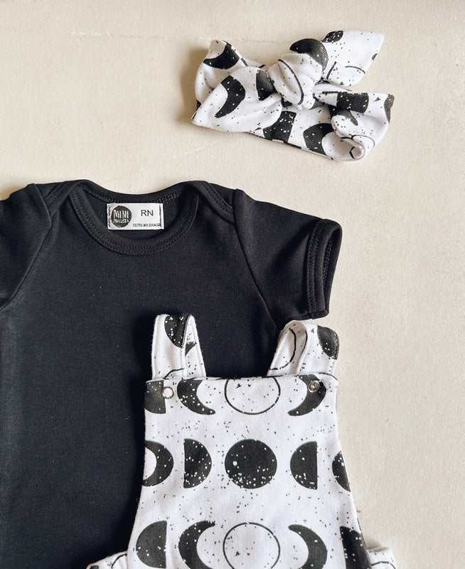 Conjunto Verão Bebê Menina Body + Jardineira + Faixinha | Preto e Lunar