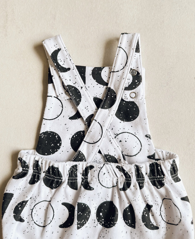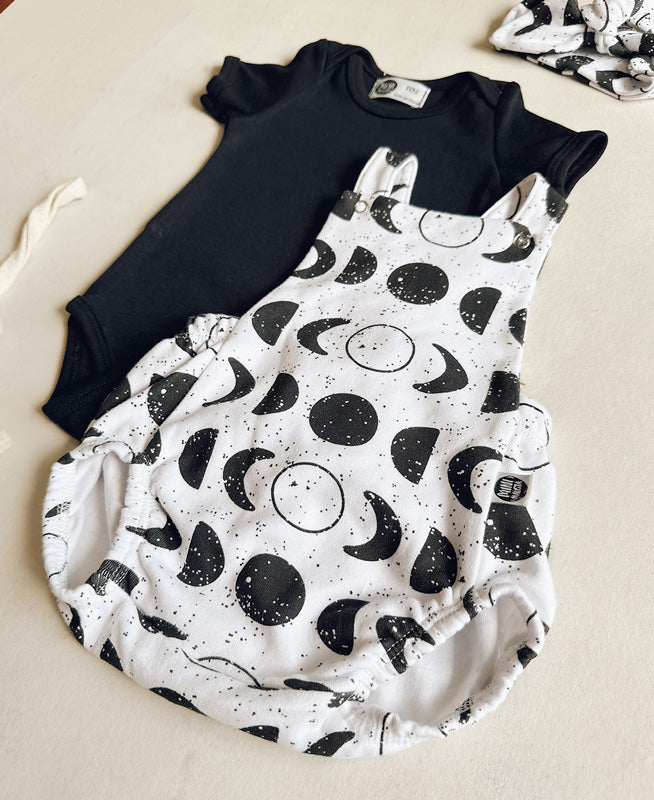 1 Jardineira na estampa Lunar — com fundo claro e fases da lua em preto, trazendo um contraste moderno e lúdico.